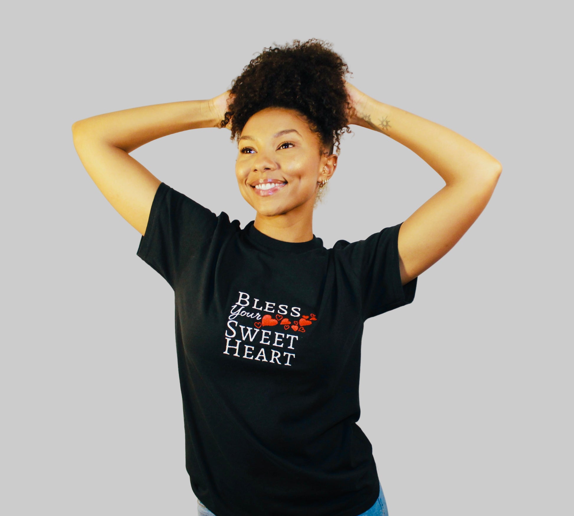 This playful embroidered tee puts a charming twist on a classic Southern saying. Featuring the phrase “Bless Your Sweet Heart” with a trail of hearts, the design delivers a double meaning—sweetly sincere, with just a hint of sass. Made from a soft, comfortable cotton blend, it’s perfect for everyday wear, casual outings, or gifting to someone who appreciates a little Southern charm with personality.